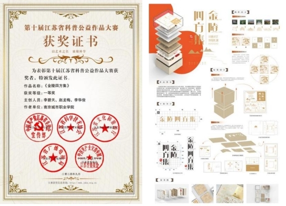 近日,从第十届江苏省科普公益作品大赛传来喜讯,数字文创学院教师李碧天、赵龙梅、李华俊(技能大师)设计的雕版印刷主题文创产品《金陵四方集》在比赛中勇夺一等奖!