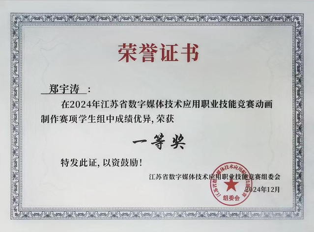 近日,江苏省数字媒体技术应用职业技能竞赛传来捷报,由王纯老师指导的问鼎官方app下载站数字文创学院2022级艺术设计专业的郑宇涛同学,在动画制作(学生组)的比赛中荣获一等奖。