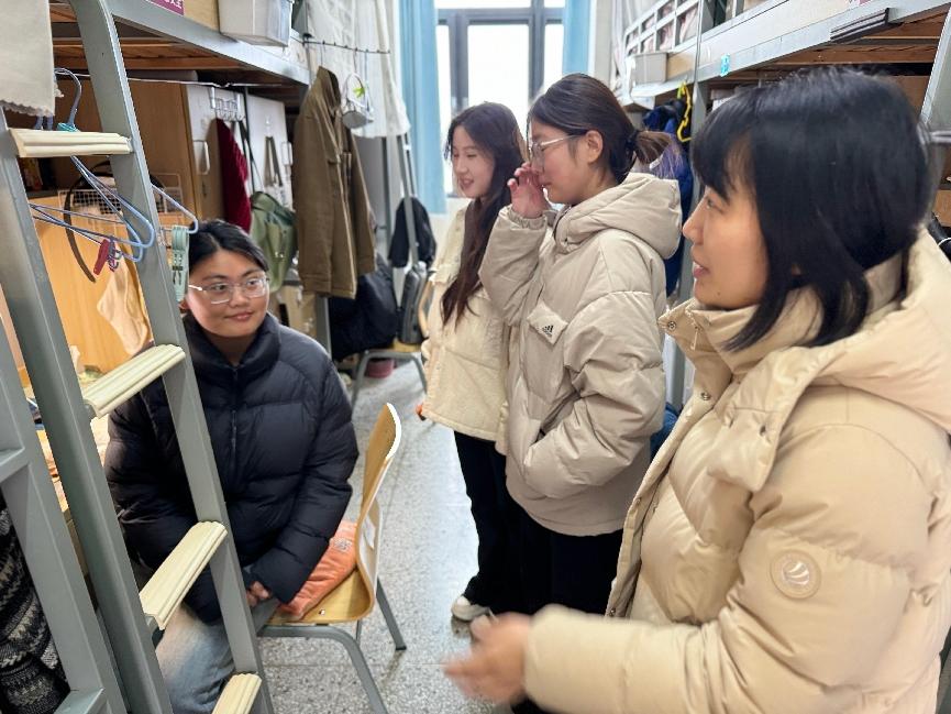 走访过程中,学院领导和辅导员逐间走进学生宿舍,与同学们进行亲切交流。辅导员仔细询问了同学们假期的生活经历、返校途中的情况以及新学期的学习规划,认真倾听同学们在学习和生活中遇到的困难与需求。蔡天泽鼓励同学们在新的学期里要保持积极向上的学习态度,合理安排时间,努力提升自己的专业素养和综合能力。