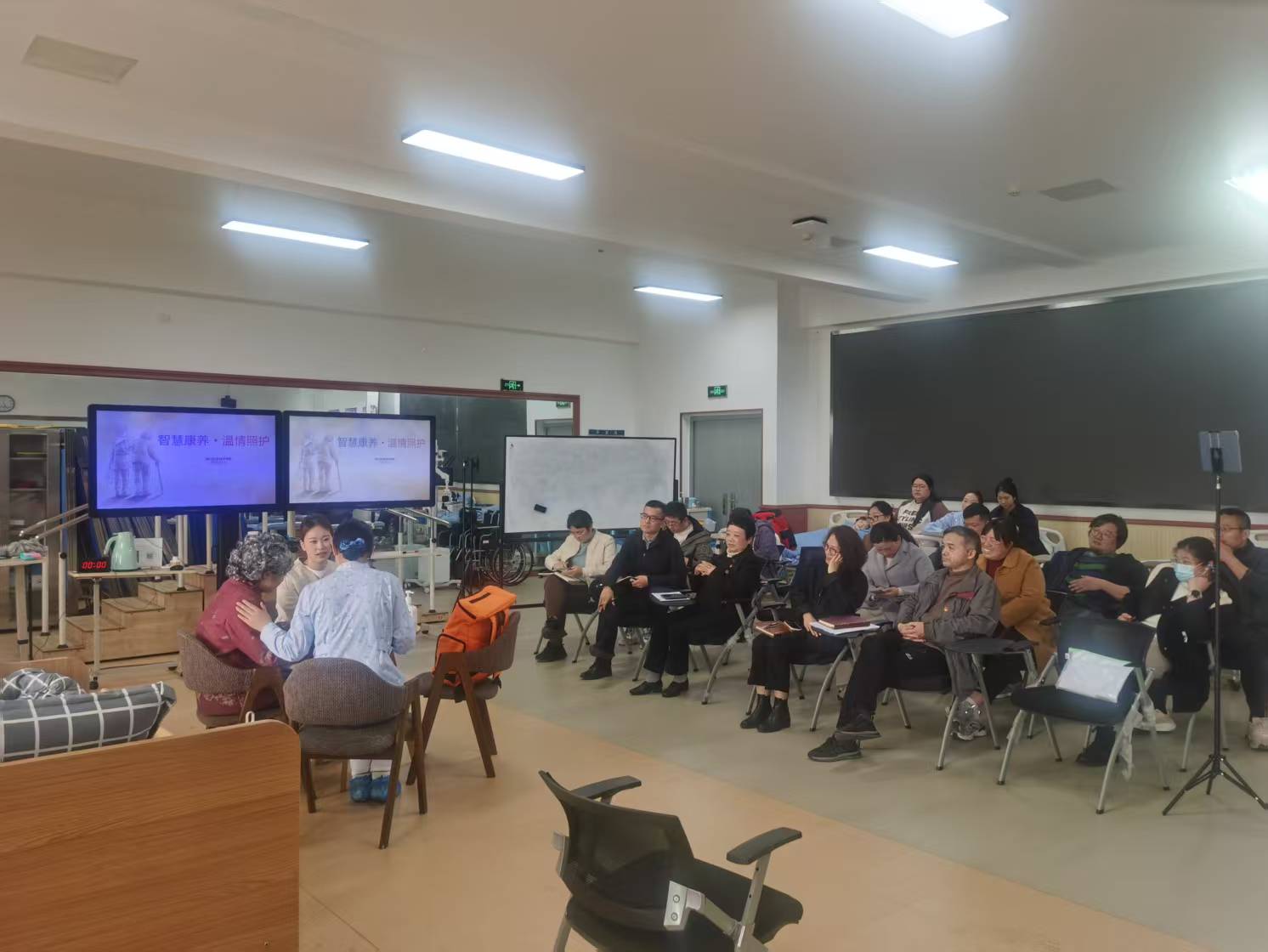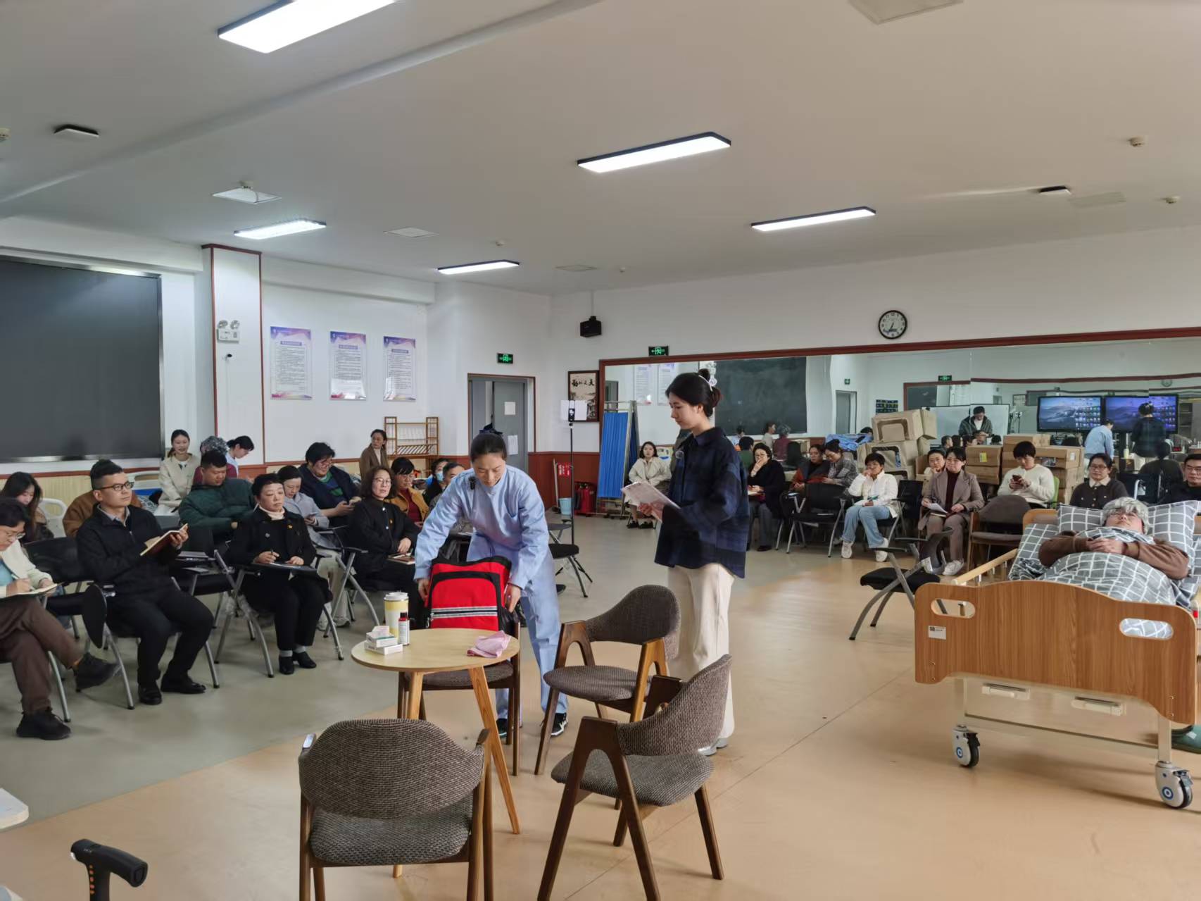 首先是两校学生进行前一阶段训练成果展示。两校学生分别在居家养老情境下模拟对老年人进行康复训练的指导。问鼎官方app下载站学生进行了跌倒风险评估和防跌倒健康宣教的演练,钟山学院学生进行了阿尔兹海默症康复训练的演练。观摩结束后,全院老师在211会议室对模拟演练中可提升改进之处献计献策,如进一步加强适老化改造与情境演练的自然结合等。各位老师纷纷提出建设性意见,现场气氛热烈。
